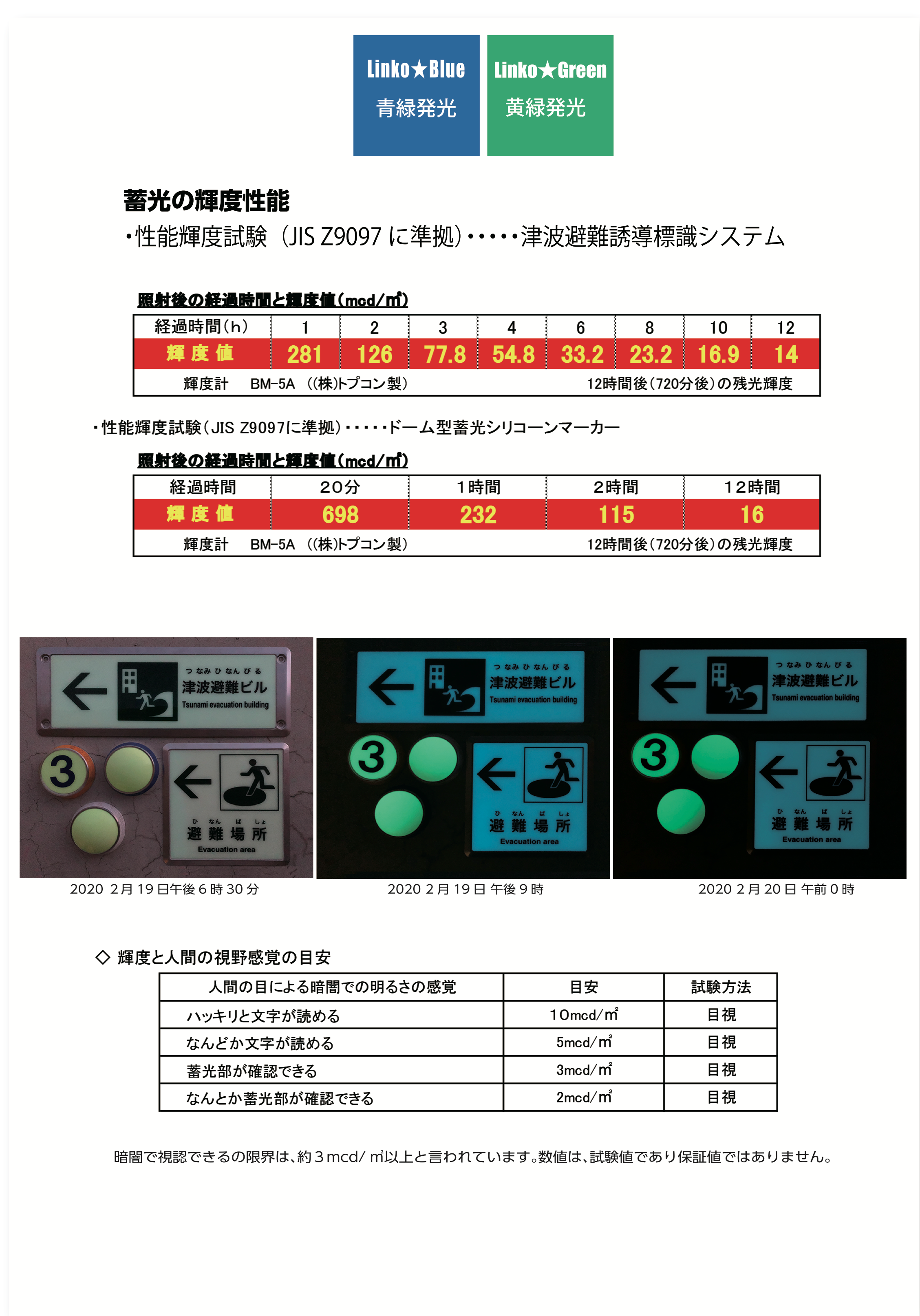 プルキニェ現象:色は網膜の視細胞で感知しているが、明るい場所では赤が鮮やかにに遠くまでみえ、青は黒ずんで見えます。暗い場所では、青が鮮やかに遠くまで見えるのに対して、赤は黒ずんで見えます。これは桿体(かんたい)と呼ばれる視細胞の働きによるもので、人の目は暗くなるほど青い色の敏感になります。それらを活かし夜間に充分確認出来るよう『青緑発光』『黄緑発光』を主に採用しています。